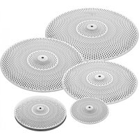 CymbalsJustDrums introduce Cymbals by 5pc Low Volume Cymbal Pack Silver – Manufactured – Cymbal Cymbal Packs are a great option, read more for more images, more details and how to order in the UK The 5pc Low Volume Cymbal Pack are the perfect solution to drummers that need near silent practice conditions but still maintain the same feeling of a high quality cymbal. The cymbals gets their reduced noise properties from the drilled holes providing less resonance than a standard cymbal. In a contemporary nickel finish these cymbals allow you to play longer into the night without upsetting the neighbours. This pack includes a 14″ hi-hat 16″ crash cymbal 18″ crash ride cymbal 20″ ride cymbal and 10″ splash cymbal.
