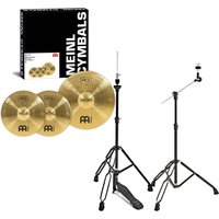 Meinl CymbalsJustDrums introduce Cymbals by Meinl HCS Cymbal Set 14″ Hi Hat & 18″ Crash/Ride & Stands Black – Manufactured by Meinl – Cymbal Cymbal Packs are a great option, read more for more images, more details and how to order in the UK The Meinl HCS Cymbal Set 14″ Hi Hat & 18″ Crash/Ride & Stands Black is ideal for new drummers needing a reliable and affordable cymbal setup with all the essentials. Built from MS63 alloy the cymbals deliver a warm harmonically rich sound that suits pop and rock styles. The 14″ hi-hats provide a crisp medium-weight response while the 18″ crash/ride gives you flexibility between accents and steady rhythm patterns.With medium-to-short sustain and a low-mid pitch these cymbals help maintain a controlled sound perfect for practice spaces or smaller venues. The included hi-hat and boom arm stands ensure youre ready to play right out of the box with quick setup and dependable support built in.